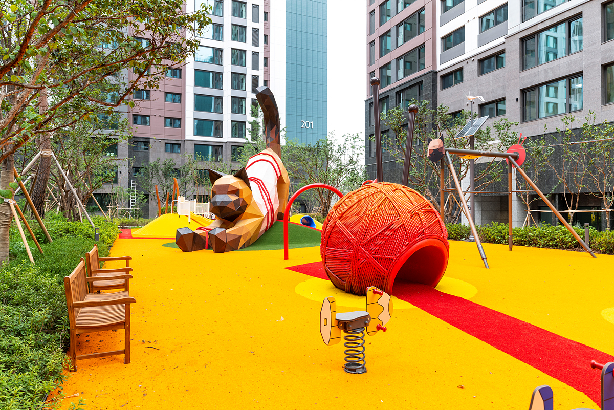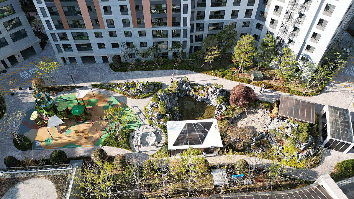특히 단지 내로 통과하는 입구 광장은 역동적인 소나무 숲과 바위, 물의 정적인 흐름을 강조한 석가산 등으로 자연풍경을 담은 광장을 조성해 예스러운 감성을 주는 반면, 반대쪽 휴게공간에는 복층의 글라스하우스를 조성해 현대적인 건축미가 돋보이도록 조성한 것이 높은 평가를 받았다.