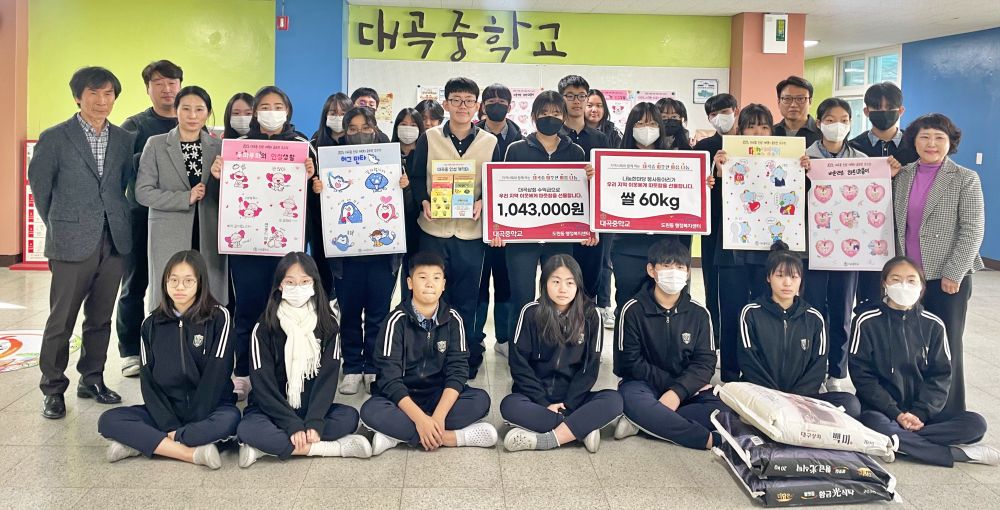 대곡중학교은 2023년 11월 6일(월)에 지난 10월 실시한 ‘대곡중 따뜻한 마음 나눔(대.따.마.나)’행사인 ‘대곡상회(아나바다 장터)’ 수익금 1,043,000원과 봉사동아리 기부 물품 쌀 60kg 등을 도원동 행정복지센터에 전달하여 어려운 이웃에 따뜻한 마음을 전달했다고 밝혔다.