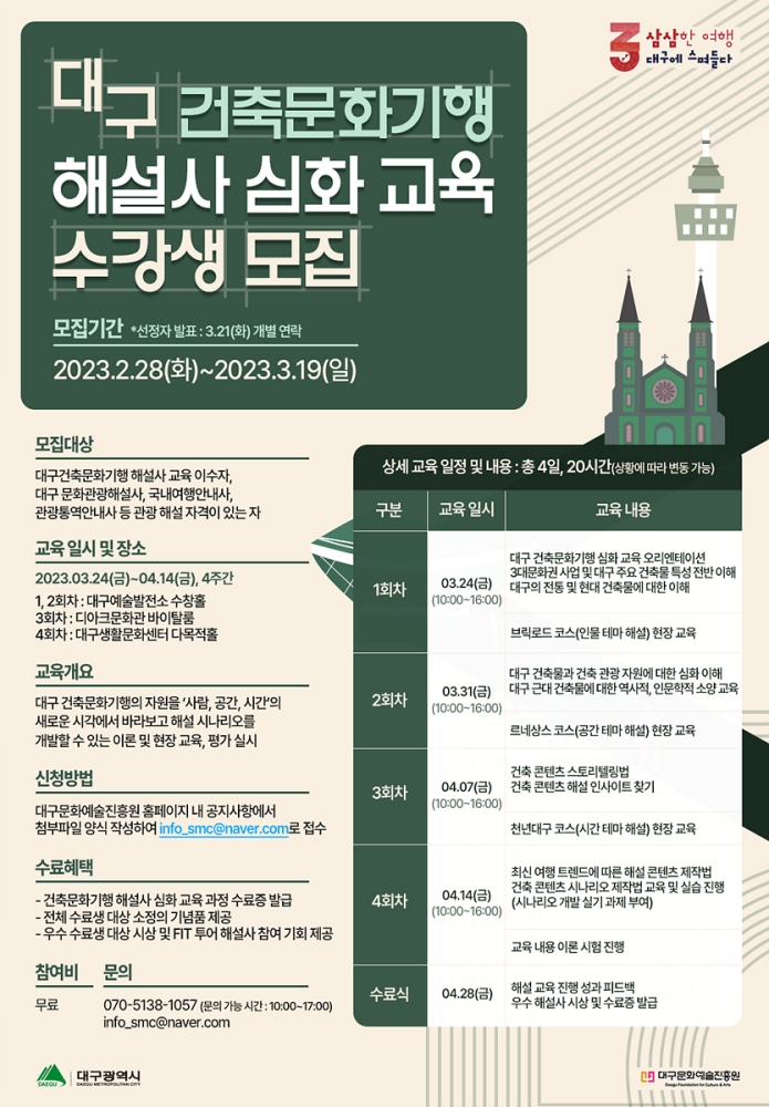 먼저, 대구에 활동하는 문화관광해설사를 대상으로 건축 자원에 대한 역사적 의미와 대상별 흥미 유발 해설기법 교육을 실시해 건축문화기행에 특화된 해설사를 양성할 계획이다.