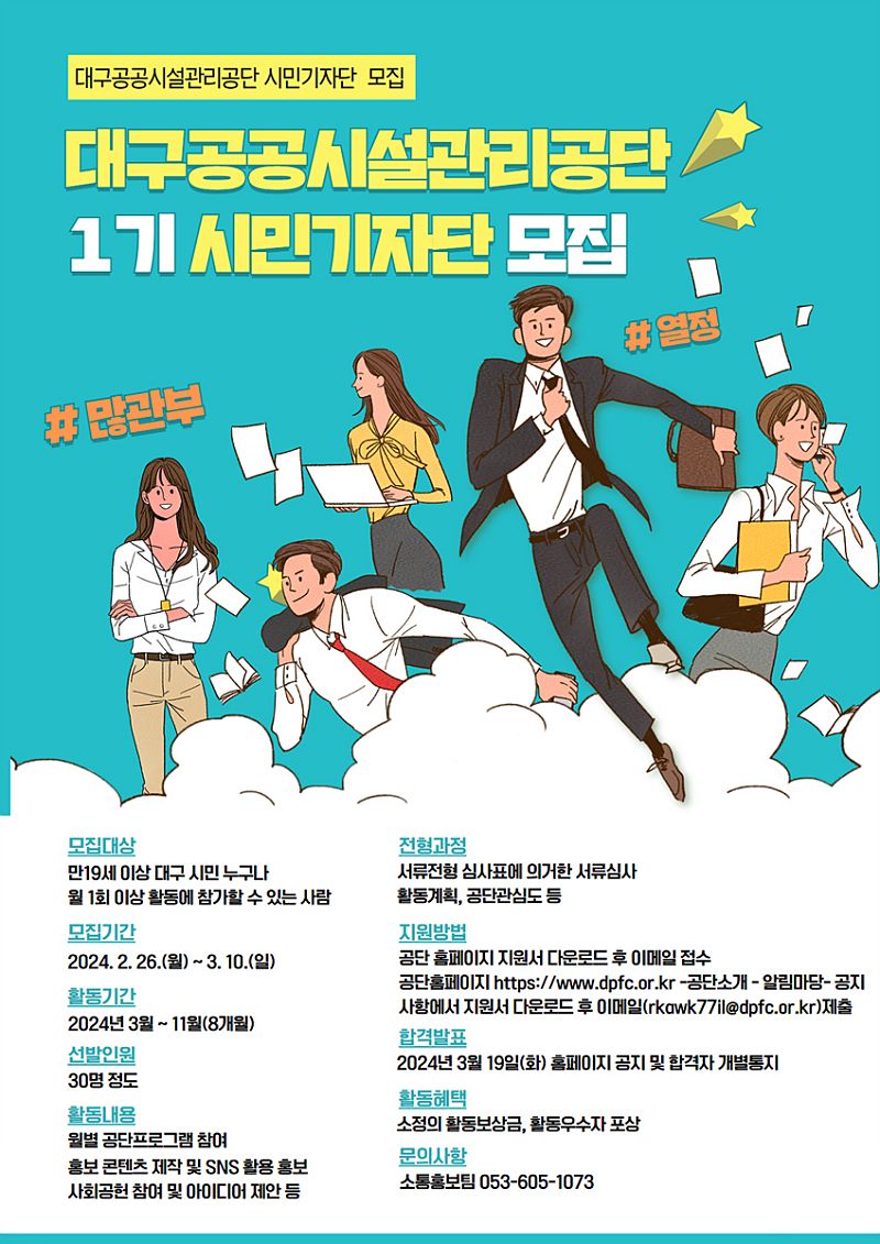 대구공공시설관리공단이 시민의 경영참여 확대를 위한 제1기 시민기자단을 2월 26일부터 3월 10일까지 모집한다. 공단은 시민이 직접 참여하는 열린 경영과 원활한 소통을 위해 제1기 시민기자단을 모집한다.