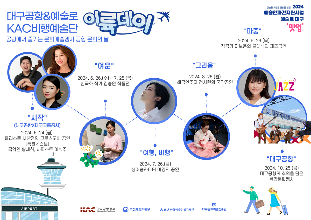대구공항은 ‘예술로 대구’ 파견 예술인(▲서찬영(음악), ▲이보은(음악), ▲전시현(국악), ▲김승연(미술), ▲이은영(음악))과 함께 올해 ‘이륙데이’를 계획해 연중 다양한 문화예술 분야의 프로그램을 선보이고 있다.