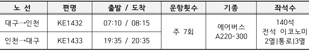 대구~인천 노선은 140석 규모의 항공기로 주 7회(매일) 운항할 계획이며, 4월 23일(일) 인천~대구 19:35분 KE1433편 운항을 시작으로 대구공항을 통한 운송서비스를 확대해 나갈 예정이다.