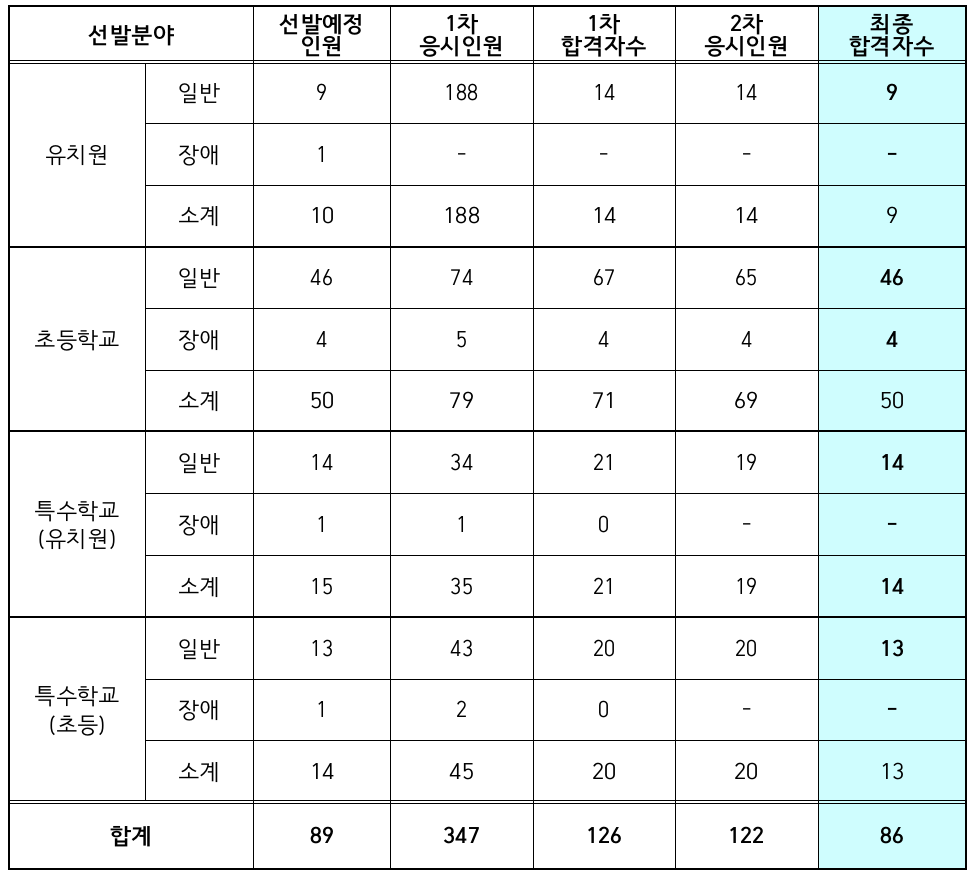 올해 합격 인원은 총 86명으로 유치원 교사 9명, 초등학교 교사 50명, 특수학교(유치원․초등) 교사 27명이 최종 합격했다. 성별에 따른 합격자 비율은 여성이 90.7%(78명)이고, 남성 합격자는 9.3%(8명)로 전년(20%, 26명) 대비 10.7%포인트 감소했다.
