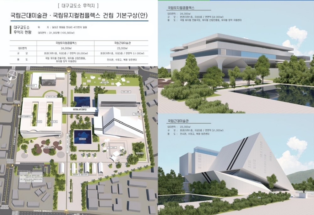 대구광역시는 윤석열 대통령의 지역공약인 국립근대미술관, 국립뮤지컬콤플렉스 등 문화예술허브 조성을 위한 사업부지를 달성군 대구교도소 후적지로 변경해 추진하는 방안을 관계기관과 협의하고 있다.
