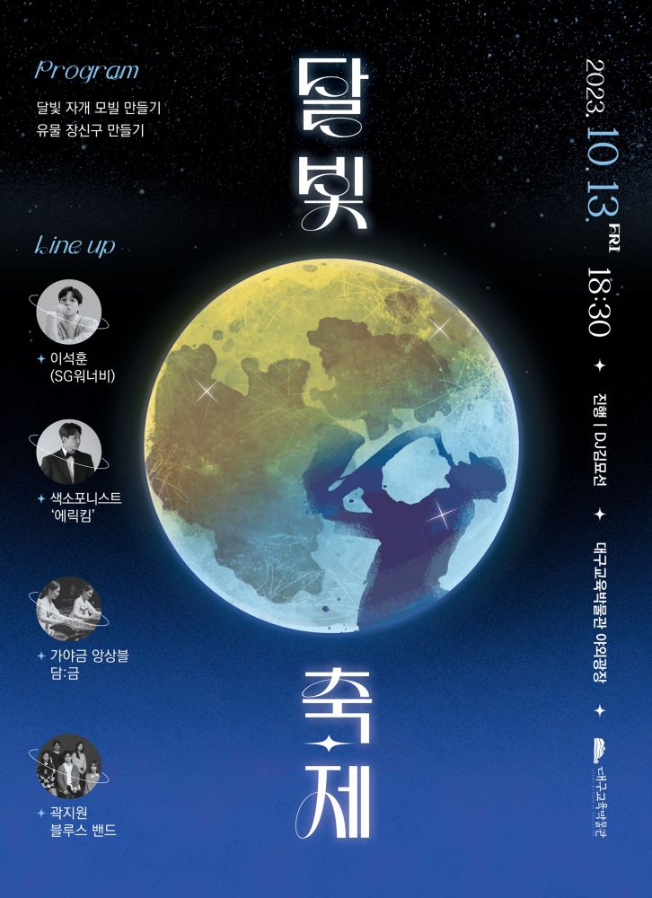 올해로 6회째를 맞이하는 ‘달빛축제’는 대구교육박물관이 매년 10월에 지역주민들과의 공감과 소통의 자리를 마련하고자 개최하는 가을축제로, 다양한 분야의 아티스트들의 공연과 가족 모두가 함께 할 수 있는 체험, 달빛 포토존 등을 즐길 수 있다.
