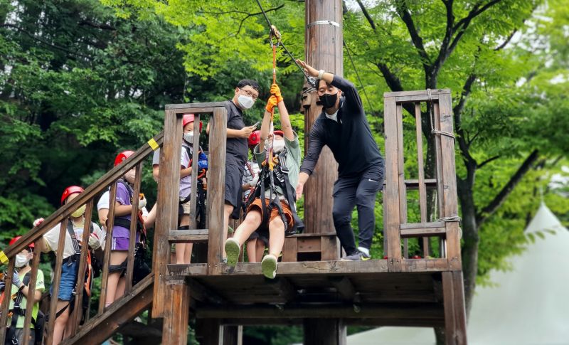 2일차 오전에는 ▲종합탈출, ▲짚라인, ▲완강기, ▲숲속탈출, ▲홍수탈출 등 안전체험 활동을 통해 산악에서의 안전 역량과 가족의 단결력을 키웠다.