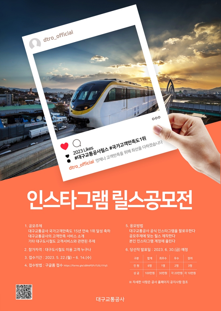 대구교통공사는 국가고객만족도(NCSI) 15년 연속 1위 달성을 기념해 ‘인스타그램 릴스 공모전’을 개최한다.