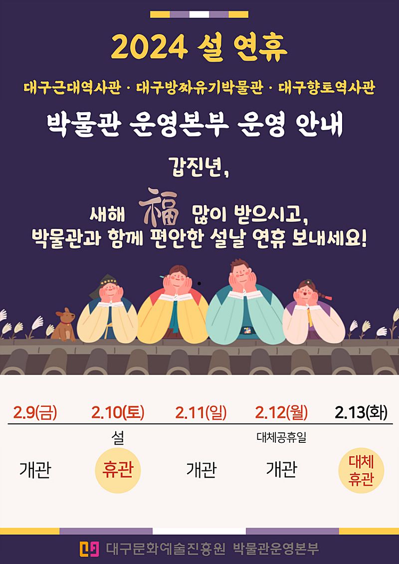 대구문화예술진흥원 박물관운영본부 소속 3개 공립박물관은 갑진년 설 연휴(’24.2.9.~2.12.) 3일간 박물관을 운영하며, 10일(토) 설 당일은 하루 휴관한다.