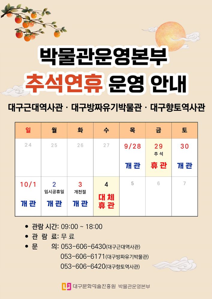 한편, 박물관운영본부 3개관(대구근대역사관·대구방짜유기박물관·대구향토역사관)은 추석 연휴가 끝나는 10월 4일(수)에 하루 휴관(대체 휴관일)한다.