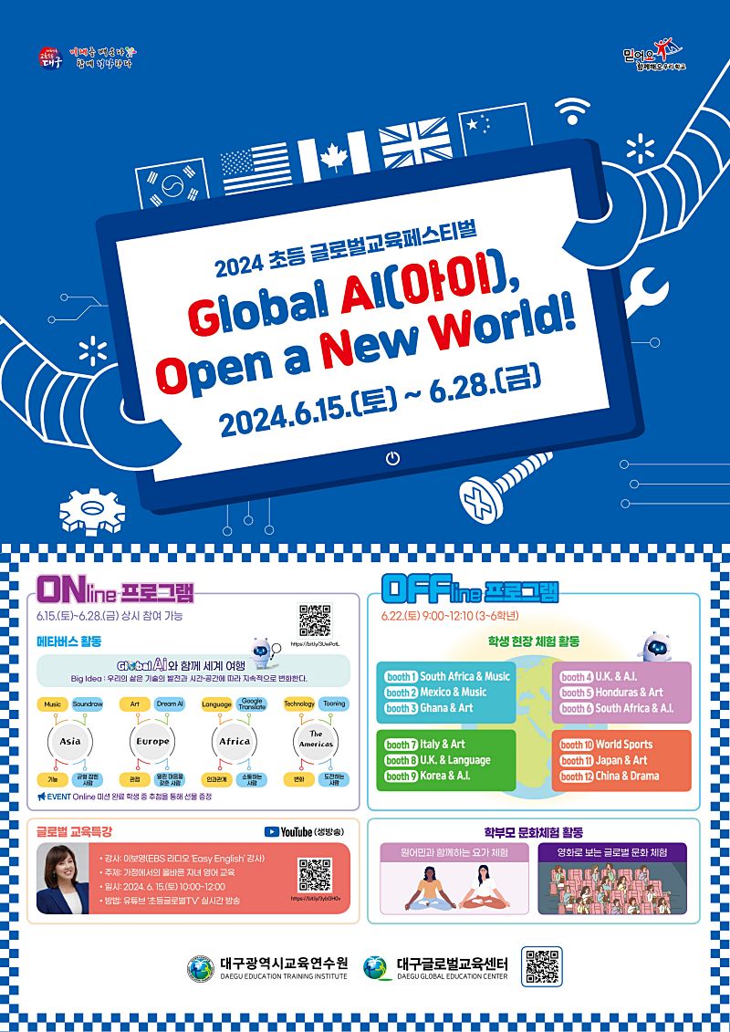 대구교육연수원 대구글로벌교육센터는 오는 6월 15일(토)부터 6월 28일(금)까지 2주간 ‘AI를 활용한 글로벌 문화 탐험, 『Global A.I.(아이), Open a New World!』’라는 주제로 2024 초등 글로벌교육페스티벌을 개최한다.