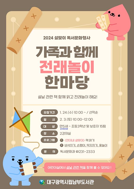 대구남부도서관(관장 고수주)은 설 명절을 맞이하여 만5세(2018년생) 어린이부터 초등 3학년을 대상으로 가족과 함께 소통·공감하고 우리 문화에 대해 이해하는 시간을 가지는 ‘가족과 함께 전래놀이 한마당’을 운영한다.