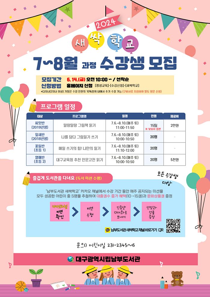 대구남부도서관은 2024년 여름학기 성인 프로그램과 5세 유아와 부모 및 6~8세 어린이를 대상으로 새싹학교 프로그램을 운영한다.