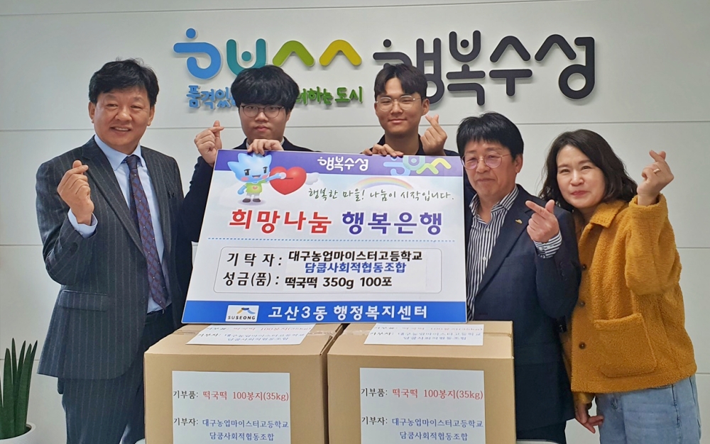 대구농업마이스터고등학교 담쿱사회적협동조합은 2023년 3월 15일(수) 지역 취약계층의 ‘따스한 밥상’을 위해 학교에서 직접 생산한 쌀로 만든 떡국떡 350g 100포를 고산3동 행정복지센터에 기부했다고 밝혔다.