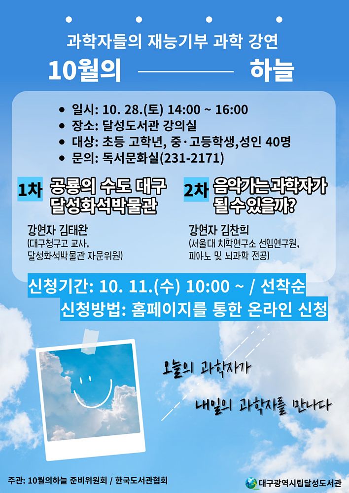 대구달성도서관은 오는 10월 28일(토) 오후 2시 달성도서관 강의실에서 과학자들의 재능기부 과학 강연인 ‘10월의 하늘’을 운영하고, 10월 25일(수)까지 참가자를 모집한다.