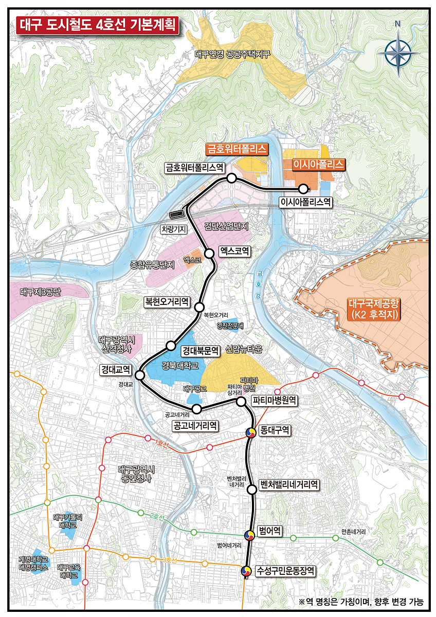 총사업비 7,756억 원을 투입하는 도시철도 4호선은 수성구민운동장역에서 경북대학교 및 엑스코를 거쳐 이시아폴리스까지 연장 12.6km로 연결되며 정거장 12개소가 건설된다.