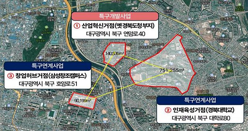 타 시도와 다른 대구만의 특색으로는 새로운 혁신산업거점이 될 경북도청 후적지를 중심으로 경북대학교, 삼성창조캠퍼스와 같은 기존의 인프라들을 적극 연계 활용하여 도심에 적합한 산업 생태계를 조성하고자 한다는 것이다.
