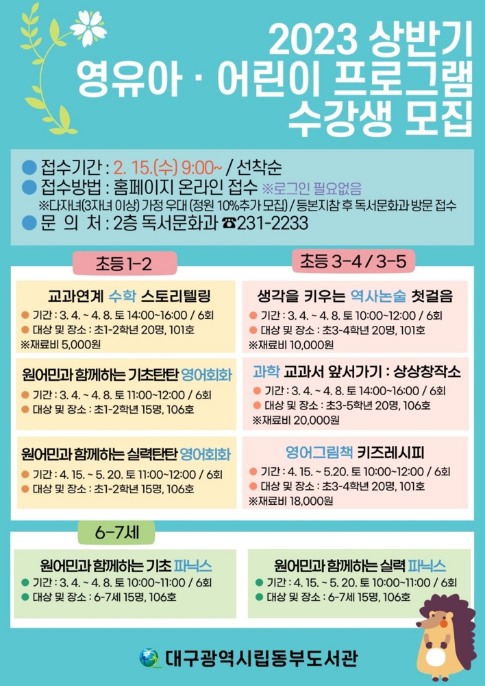 수강생은 2월 14일(화) 오전 9시부터 선착순으로 모집하며, 동부도서관 홈페이지(library.daegu.go.kr/dongbu)를 통해 신청하면 된다.