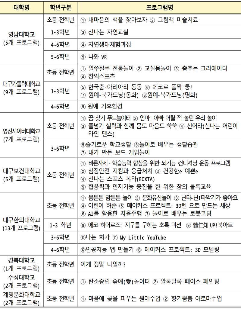 대구동부교육지원청은 2월 20일(화)에 지역 8개 대학교*와 「지역대학 연계 방과후·초등돌봄 프로그램 운영」업무협약을 체결한다.