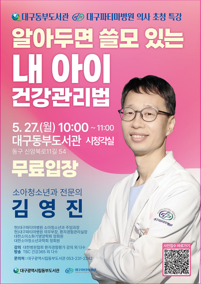 이번 특강은 대구동부도서관과 대구파티마병원과 협력하여 ‘다 건강한 도서관-병원 협력 서비스’의 일환으로 이루어지며, 대구파티마병원 소아청소년과 김영진 전문의가 강사로 나서 아이의 건강을 지키는 데 필요한 다양한 지식을 설명하고, 일상에서 활용할 수 있는 간단하고 효과적인 건강 관리법에 대해서 강연한다.