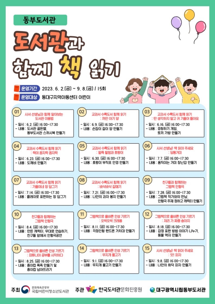 대구동부도서관은 국립어린이청소년도서관이 주최하는 「2023년 도서관과 함께 책 읽기」 공모사업에 선정되어 6월 2일(금)부터 9월 8일(금)까지 지식정보취약계층 어린이를 위한 독서문화 프로그램을 운영한다고 밝혔다.
