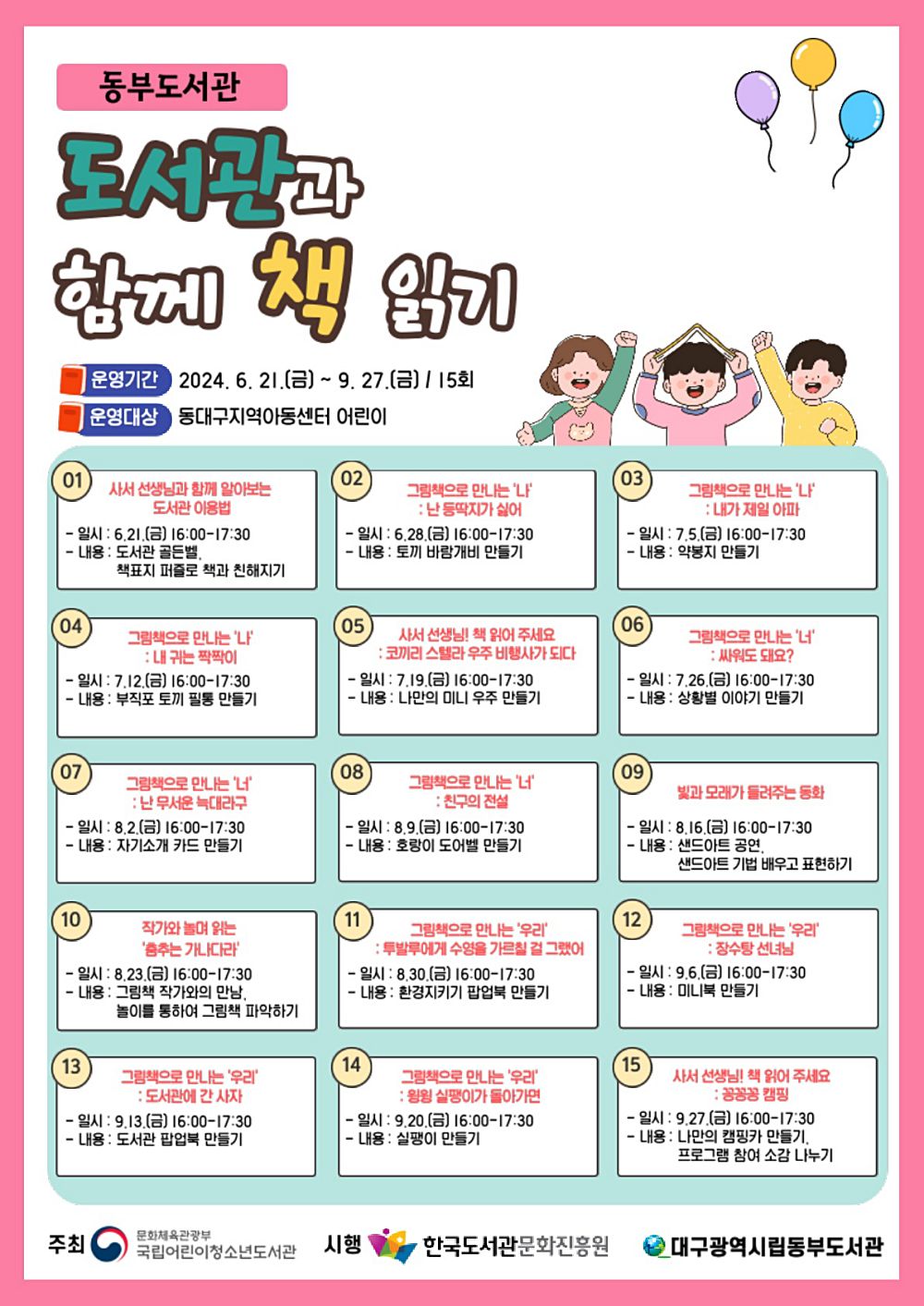 대구동부도서관은 국립어린이청소년도서관이 주최하는 「2024년 도서관과 함께 책 읽기」 공모사업에 2년 연속 선정되어, 6월 21일(금)부터 9월 27일(금)까지 지식정보취약계층 어린이를 위한 독서문화 프로그램을 운영한다.