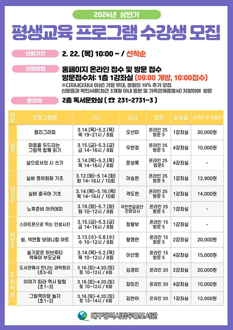 대구두류도서관은 지역주민들에게 평생학습의 기회를 제공하고 학생들의 창의·인성 함양과 도서관 이용 활성화를 위해 2월 22일(목)부터 ‘2024년 상반기 평생교육 프로그램’ 수강생을 모집한다.