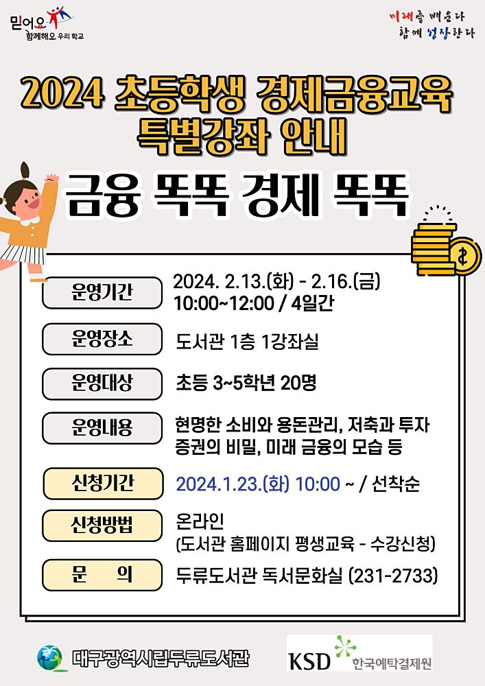 대구두류도서관은 오는 2월 13일(화)부터 16일(금)까지 4일간 오전10시부터 12시까지 초등학생 3~5학년을 대상으로 경제금융교육 특별강좌를 운영한다고 밝혔다.