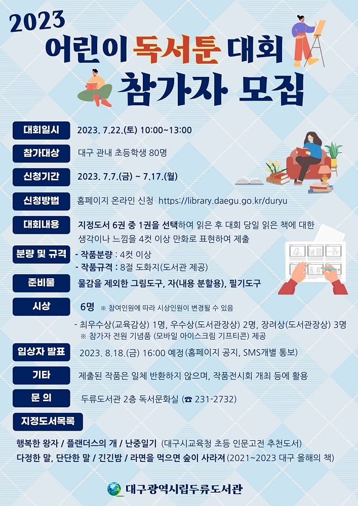 참가를 희망하는 초등학생은 7월 7일(금) 오전 10시부터 도서관 홈페이지(library.daegu.go.kr/duryu)를 통해 사전 신청 후 참가가 가능하다.