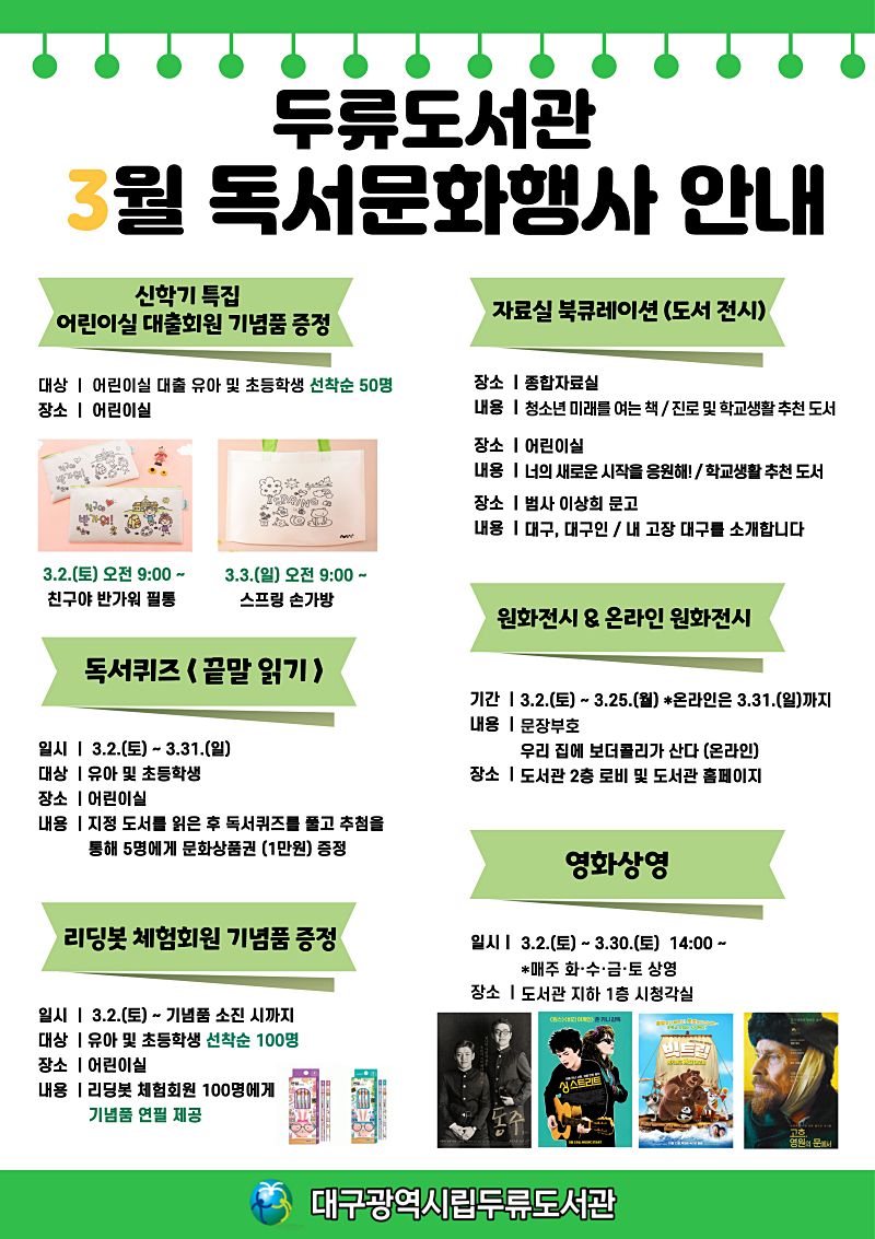 대구두류도서관은 3월 새학기를 맞아 학생 및 지역주민을 위한 다양한 체험, 전시 행사를 운영한다.