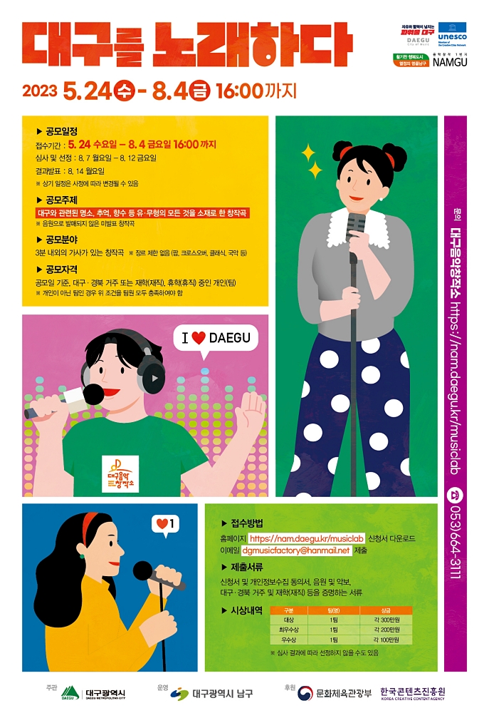 대구광역시가 주관하고 남구가 운영하는 대구음악창작소에서 대구의 브랜드 가치를 향상시키고 지역 뮤지션의 창작 역량을 강화시키기 위해 제7회 「대구를 노래하다」공모전을 개최한다.