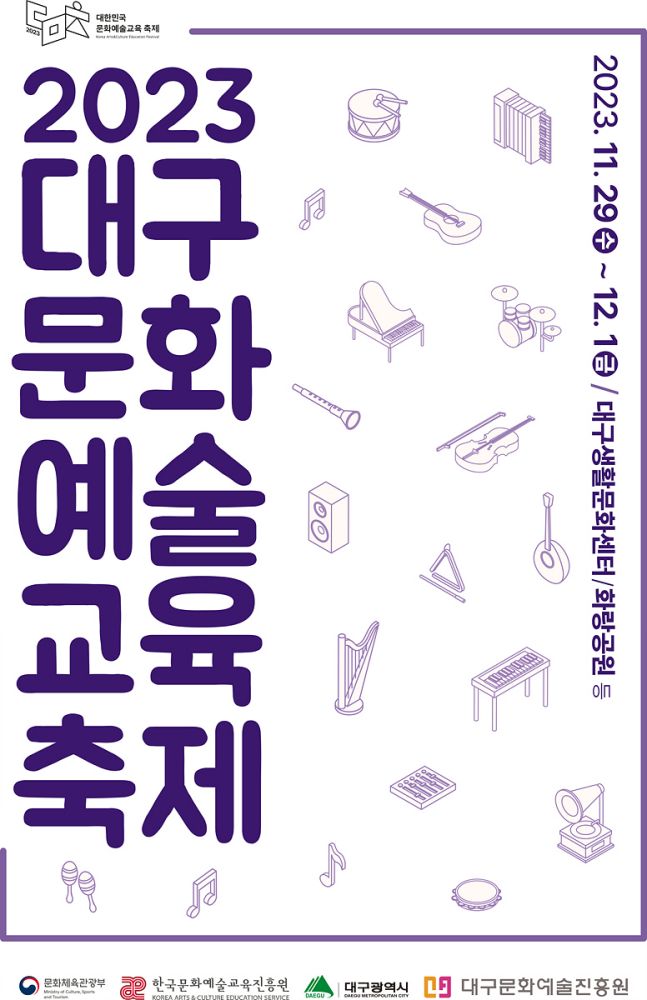 대구생황문화센터와 인근 화랑공원을 중심으로 펼쳐지는 이번 축제는‘우리가 함께 만드는 문화예술교육도시 대구’를 주제로 개최된다. 2023년 문화예술교육 공모사업 선정단체의 성과를 시민과 함께 공유하고 다양한 참여 프로그램을 펼치며 대구문화예술교육의 대시민 교류의 장을 마련하고자 한다. 축제 간 참여를 원하는 시민 모두가 함께 즐길 수 있는 선정단체들의 문화예술 전시, 공연, 체험 프로그램이 꾸려질 예정이다.