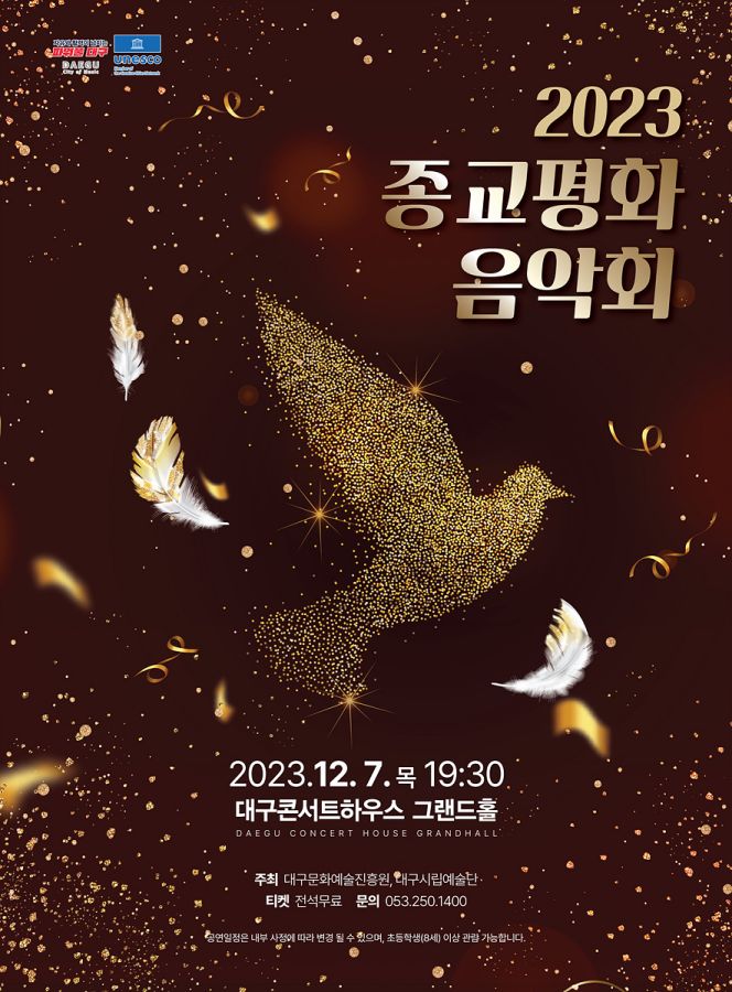 오는 12월 7일(목) 오후 7시 30분 대구문화예술진흥원․대구시립예술단 주최로 ‘2023 종교평화음악회’를 대구콘서트하우스 그랜드홀에서 개최한다.