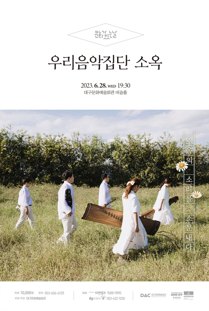 대구문화예술회관은 매월 마지막 주 수요일에 펼치는 DAC 문화가 있는 날의 일환으로 6월 28일(수) 오후 7시 30분, 대구문화예술회관 비슬홀에서 창작국악 연주단체 ‘우리음악집단 소옥’이 무대에 오른다.