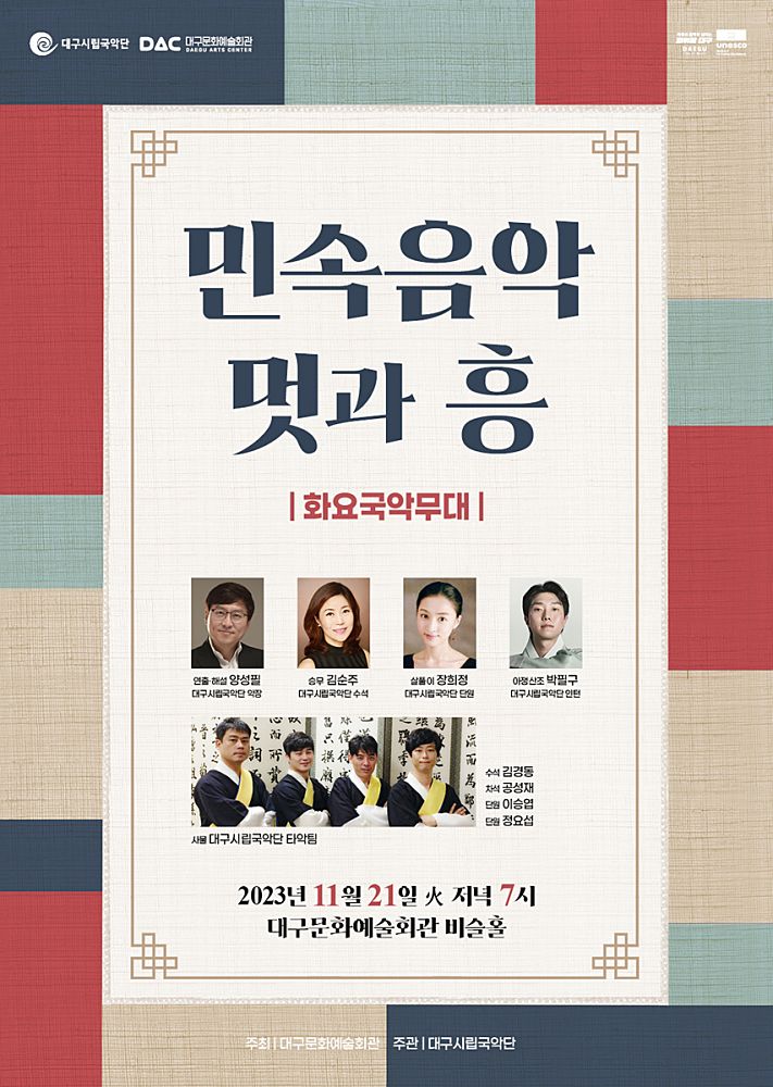 대구시립국악단의 화요국악무대 <민속음악 멋과 흥>이 11월 21일(화) 저녁 7시 대구문화예술회관 비슬홀에서 펼쳐진다. 이번 공연은 양성필 대구시립국악단 악장의 연출과 해설로 전통음악 가운데 민속음악을 중심으로 펼쳐진다. 올해 마지막 화요국악무대이다.