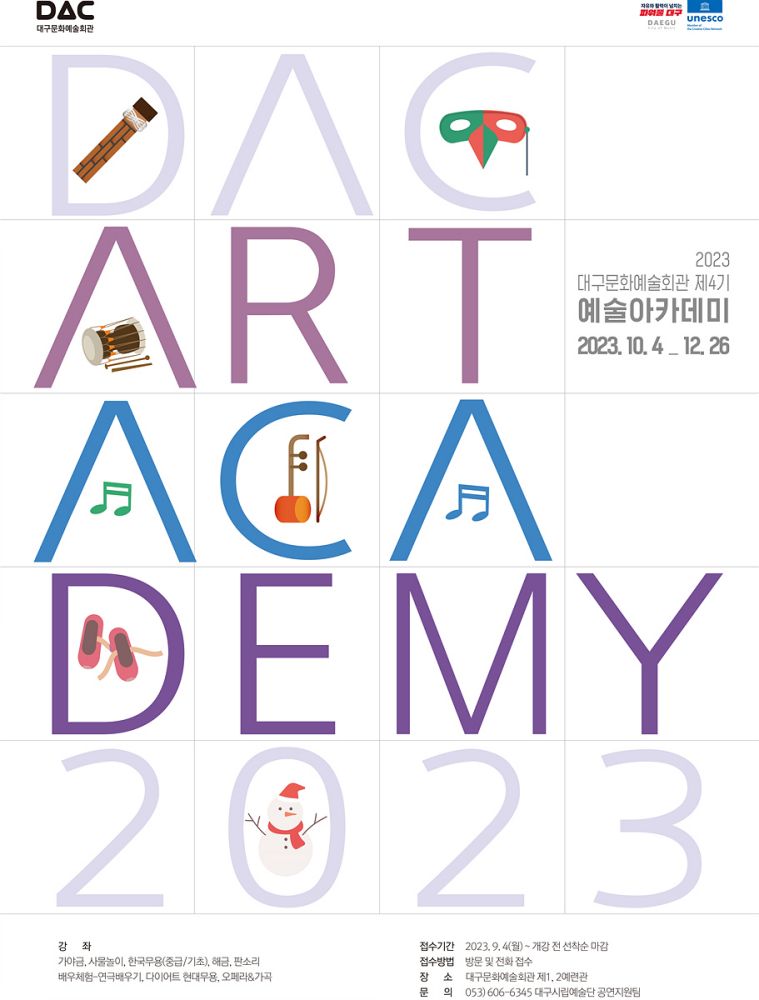 대구문화예술진흥원 대구문화예술회관은 대구 시민들에게 문화예술 창의성 개발과 체험 기회 제공을 위한 예술교육 사업인 <2023 제4기 예술아카데미> 수강생을 모집한다.