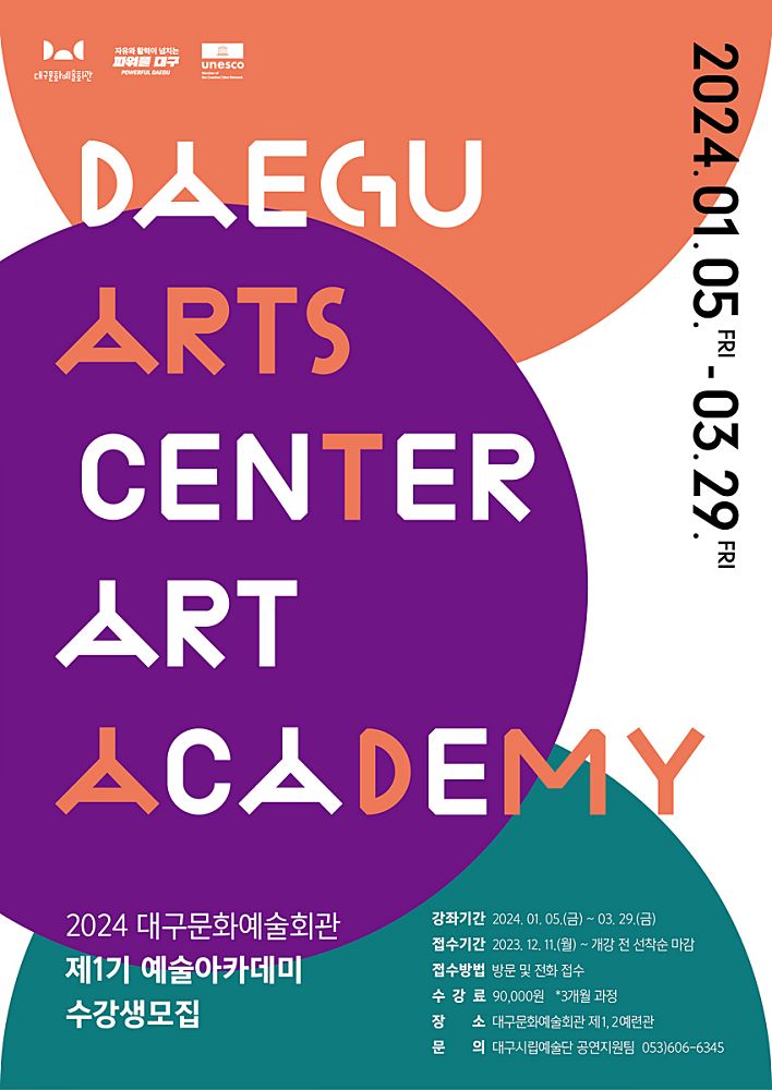 대구문화예술진흥원 대구문화예술회관은 대구 시민들에게 문화예술 창의성 개발과 체험 기회 제공을 위한 예술교육 사업인 <2024 제1기 예술아카데미> 수강생을 모집한다.