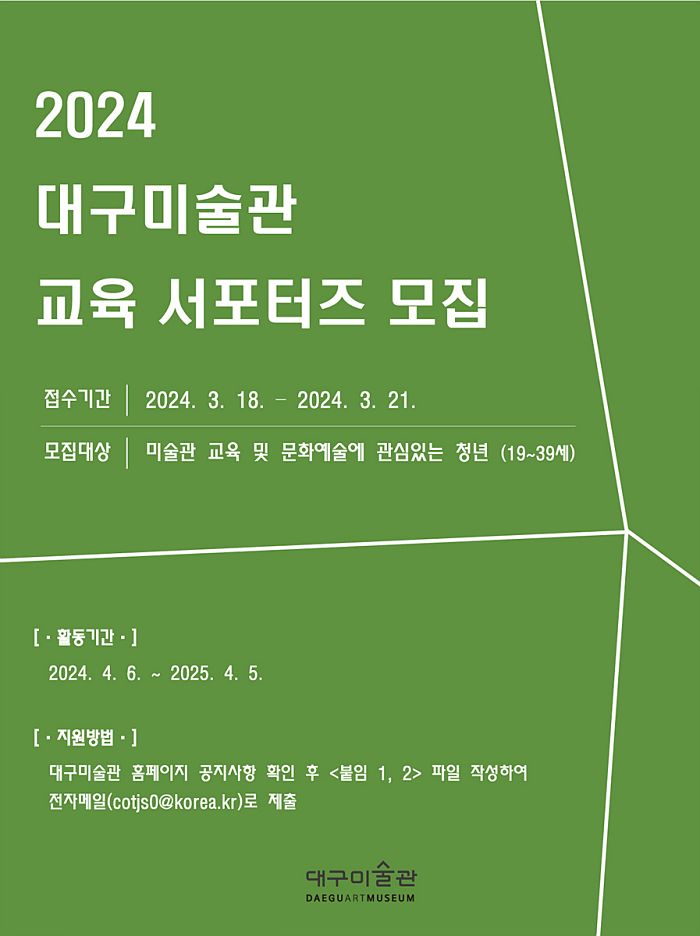 대구문화예술진흥원 대구미술관은 미술관 교육 프로그램과 문화예술 활동에 관심 있는 청년을 대상(19~39세)으로, 대구미술관 교육 분야에서 자원봉사 활동을 할 ‘서포터즈’를 3월 18일(월)부터 21일(목)까지 모집한다.