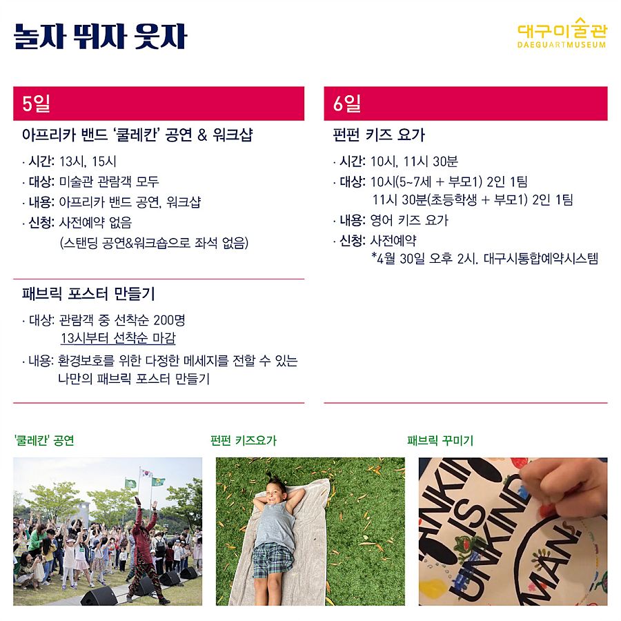 대구미술관은 어린이날을 기념해 5~6일 양일간 무료입장 이벤트를 실시하고, 가족이 함께 즐길 수 있는 전시와 아프리카 댄스 워크숍, 패브릭 포스터 만들기 등을 체험할 수 있는 ‘놀자, 뛰자, 웃자’ 이벤트를 진행한다.