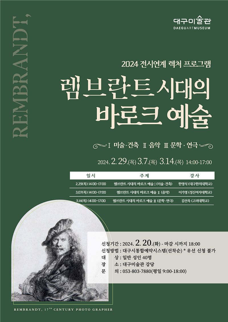 대구미술관은 ‘렘브란트, 17세기의 사진가’ 전시 연계로 성인 렉처 프로그램인 ‘렘브란트 시대의 바로크 예술’을 2월 29일(목), 3월 7일(목), 14일(목) 오후 2시 대구미술관 강당에서 실시한다.