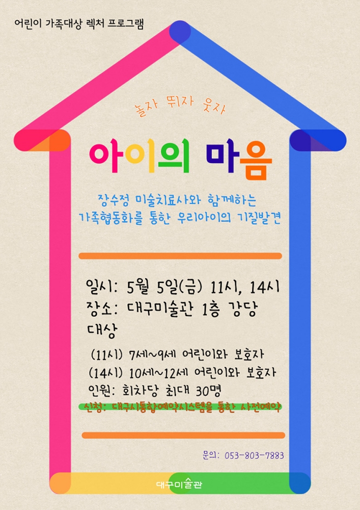 이와 함께 5월 5일(금) 어린이날에는 가정의 달을 맞아 어린이·가족대상 교육 프로그램인 ‘놀자 뛰자 웃자-아이의 마음’을 운영한다. 11시, 14시 대구미술관 1층 강당에서 운영하며, 미술치료사의 강연과 더불어 가족협동화를 통해 아이의 기질을 발견하고 알아볼 수 있다.