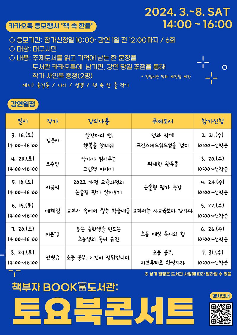 한편, 3월 16일(토)에 열리는 토요북콘서트는 2월 21일(수) 오전 10시부터 북부도서관 누리집에서 접수한다. 토요북콘서트의 전체 일정과 각 강의별 접수 시작일은 대구북부도서관 누리집(library.daegu.go.kr/bukbu)에서 확인할 수 있으며, 자세한 사항은 독서문화과(☎231-2623)로 문의하면 된다.