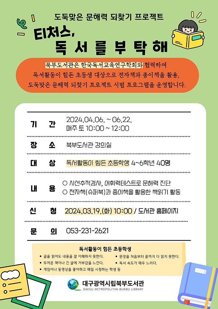 대구북부도서관은 한국독서교육연구학회와 손잡고 스마트폰 및 동영상 과몰입 등으로 독서에 어려움을 겪고 있는 초등학생을 위해 문해력 되찾기 프로젝트 ‘티처스, 독서를 부탁해’를 4월 6일(토)부터 6월 22일(토)까지 운영한다.