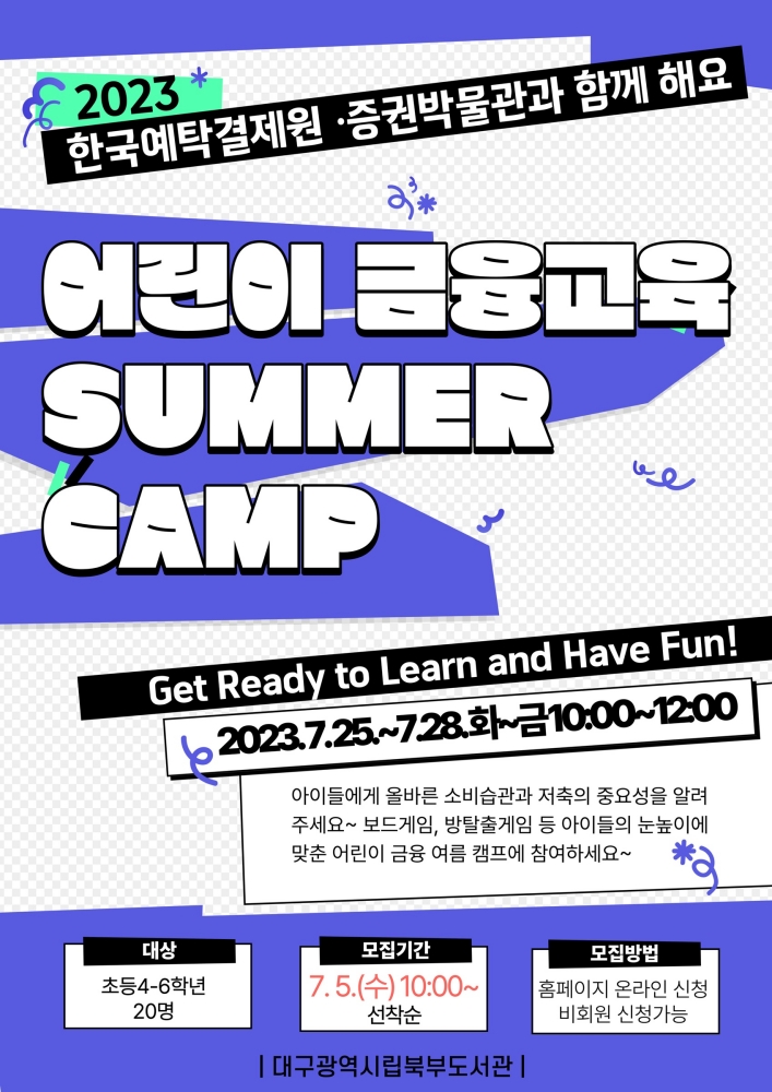 대구북부도서관은 여름방학을 맞이해 초등학교 4~6학년을 대상으로 올바른 소비습관과 저축의 중요성을 알려주는 ‘2023 어린이 금융교육 SUMMER CAMP’를 운영한다.