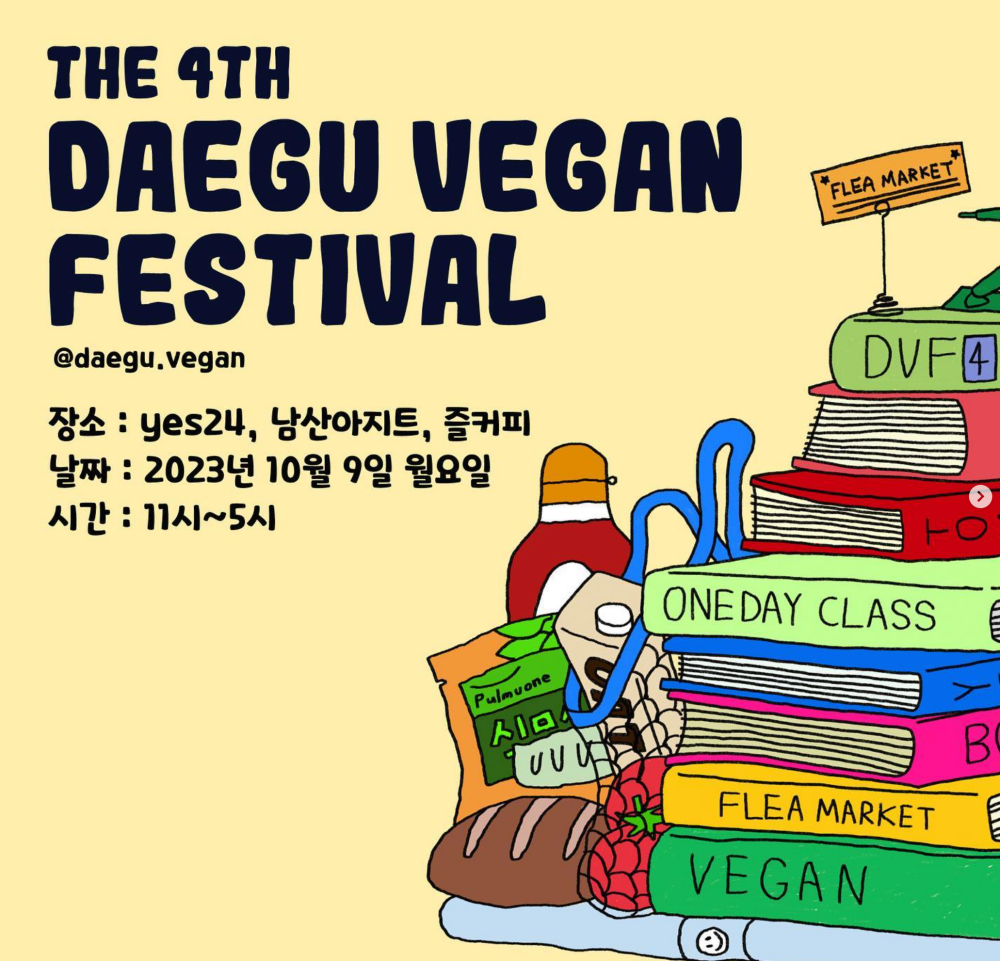 ‘대구비건페스티벌’이 10월 9일(월) 오전 11시부터 오후 5시까지 yes24중고서점, 즐커피, 남산아지트 세 곳에서 <2023년 대구 비건페스티벌> 4회차가 진행됩니다.