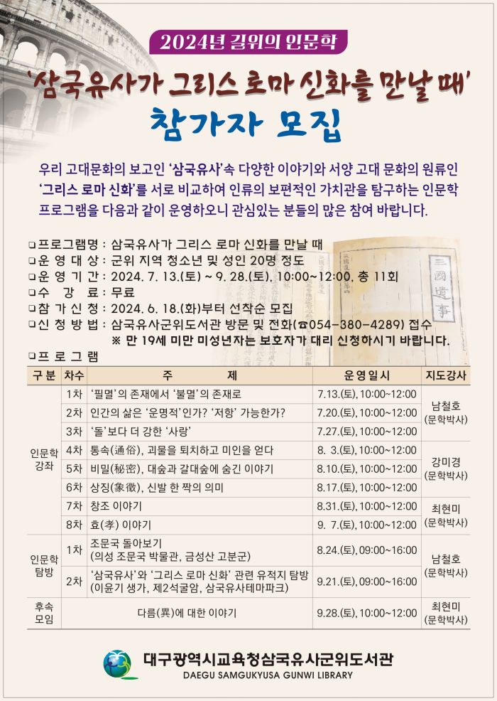 삼국유사군위도서관은 2024년 길 위의 인문학 ‘삼국유사가 그리스 로마 신화를 만날 때’를 오는 7월 13일(토)부터 9월 28일(토)까지 11회에 걸쳐 운영한다.
