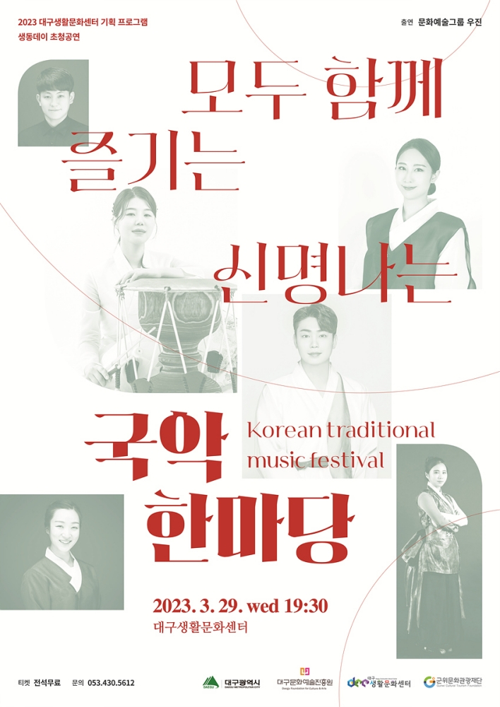 특히 3월 29일(수)에는 대구광역시와 경상북도 군위군의 통합을 앞두고 아름다운 상생 발전과 문화적 정서 통합을 위해 군위관광문화재단 협력형 생활문화 지원단체인 문화예술그룹 우진의 초청공연이 펼쳐진다. 문화예술그룹 우진은 남녀노소 모두가 어우러질 수 있는 신명나는 국악한마당으로 생동데이의 첫 문을 연다.
