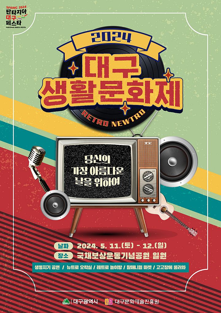 대구광역시와 (재)대구문화예술진흥원(이하 ‘문예진흥원’)은 지역 생활문화동호회와 시민이 함께하는 2024 대구생활문화제를 5월 11일(토)부터 5월 12일(일)까지 이틀간 국채보상운동기념공원에서 개최한다. 축제는 ‘레트로x뉴트로’를 주제로 공연, 전시, 홍보, 체험 등 다양한 프로그램으로 진행될 예정이다.