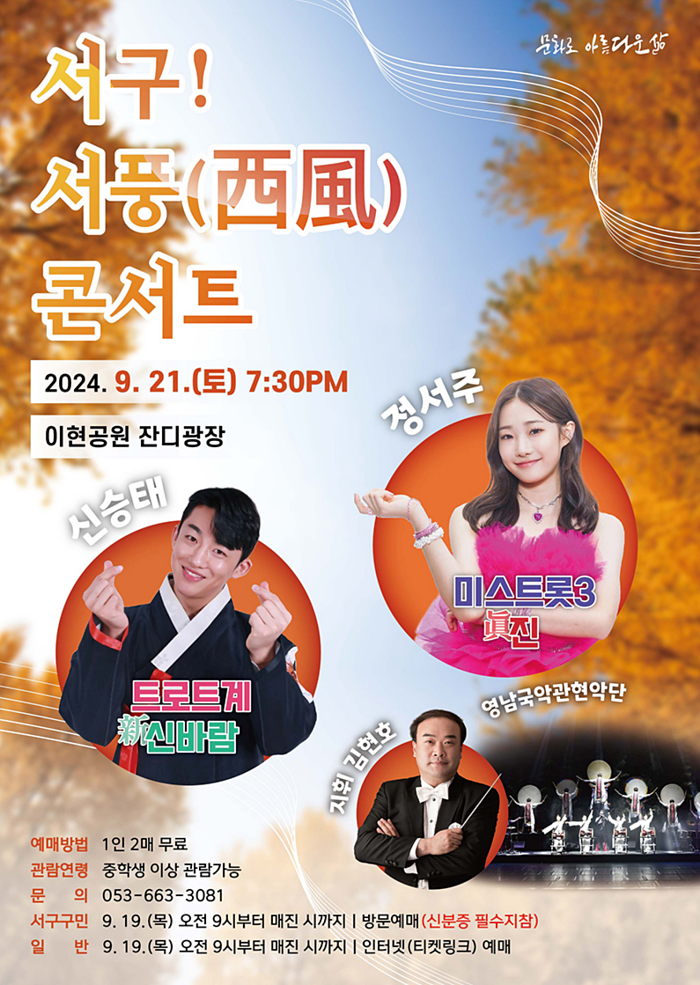 서구! 서풍(西風) 콘서트는 매년 9월 이현공원에서 국악 오케스트라와 트로트 가수의 협연으로 기획한 퓨전국악콘서트로 올해는 가수 정서주, 신승태, 박규리를 초청하여 노리광대의 신명나는 대북 및 판굿 공연과 함께 영남국악관현악단(지휘 김현호)의 협연으로 진행한다.