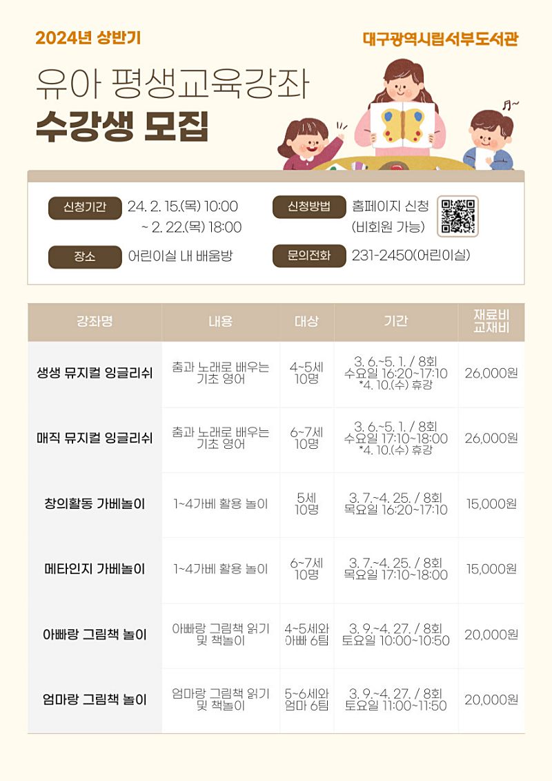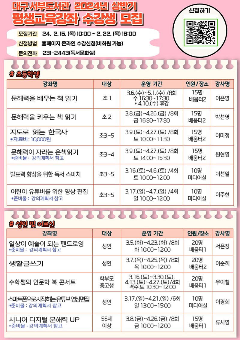 대구서부도서관은 영유아, 초등학생, 성인을 위한 독서문화강좌 17개를 마련하고, 2월 15일(목) 오전 10시부터 수강생을 모집한다.