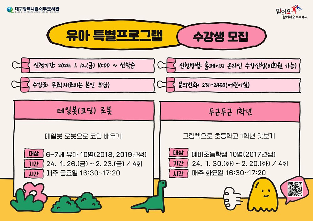 개설 프로그램은 입학을 앞둔 예비 초등학생을 대상으로 그림책을 통해 1학년 생활을 맛보는 ▲두근두근 1학년(8세), 테일봇 로봇을 활용하여 코딩과 탄소중립의 개념을 재미있게 익혀보는 ▲테일봇(로봇) 코딩(6~7세) 등 2개 프로그램이다.